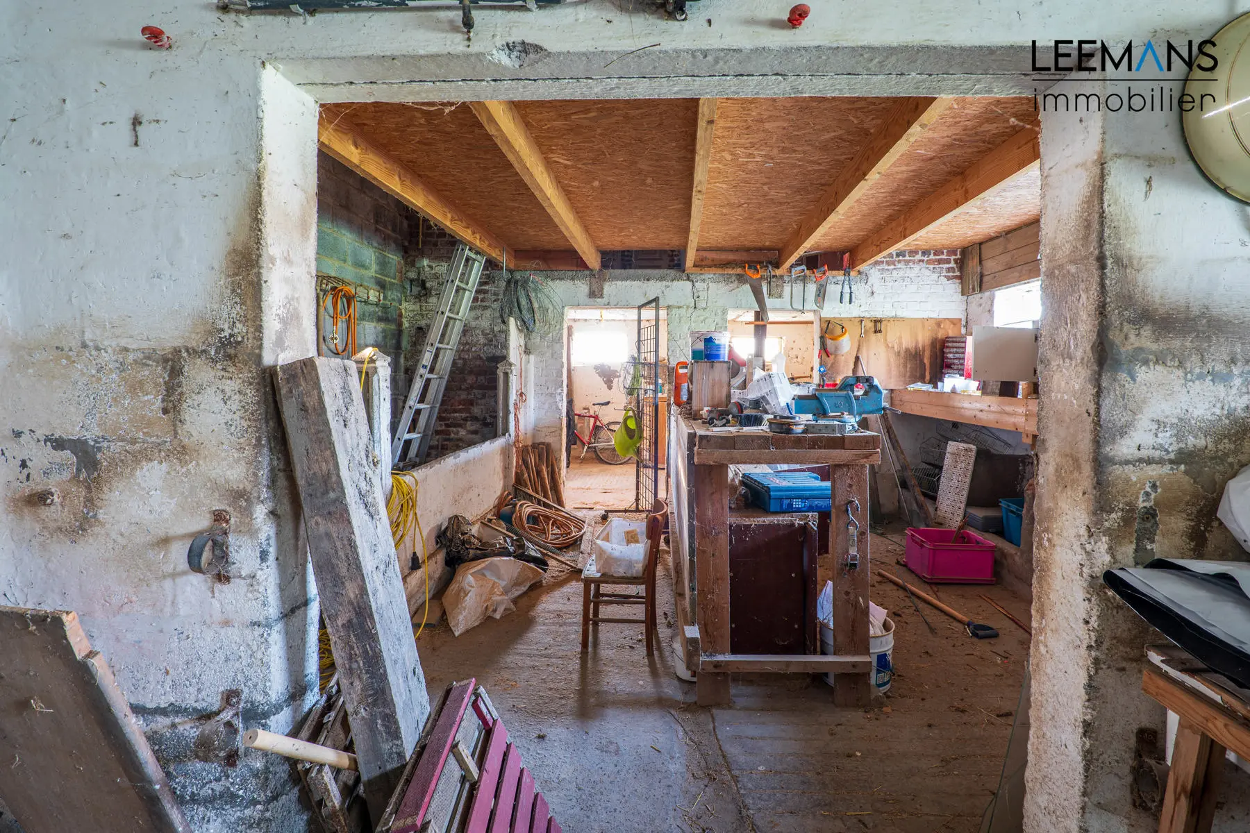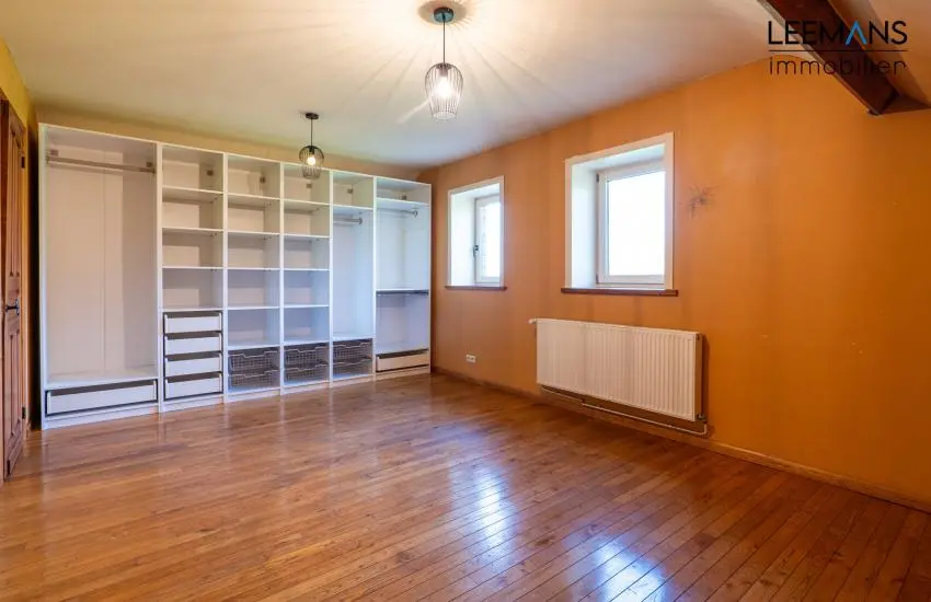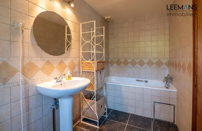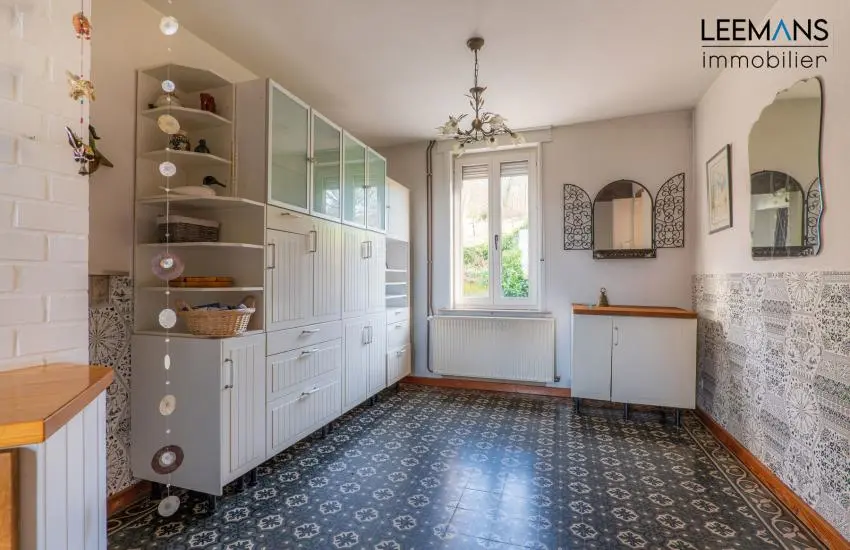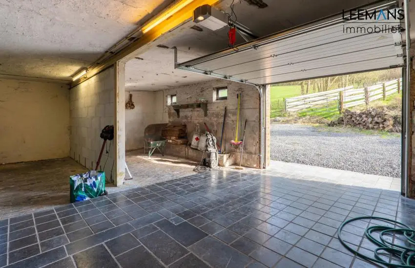 La maison se compose comme ceci: Au rez-de-chaussée, un hall donne dans le grand séjour de près de 35m², avec feu au bois double face. Vous y retrouverez également une cuisine avec deux salles à manger (24 et 11m²), un bureau et une salle de bain. Vous avez également un accès garage de 50m² avec porte sectionnelle.