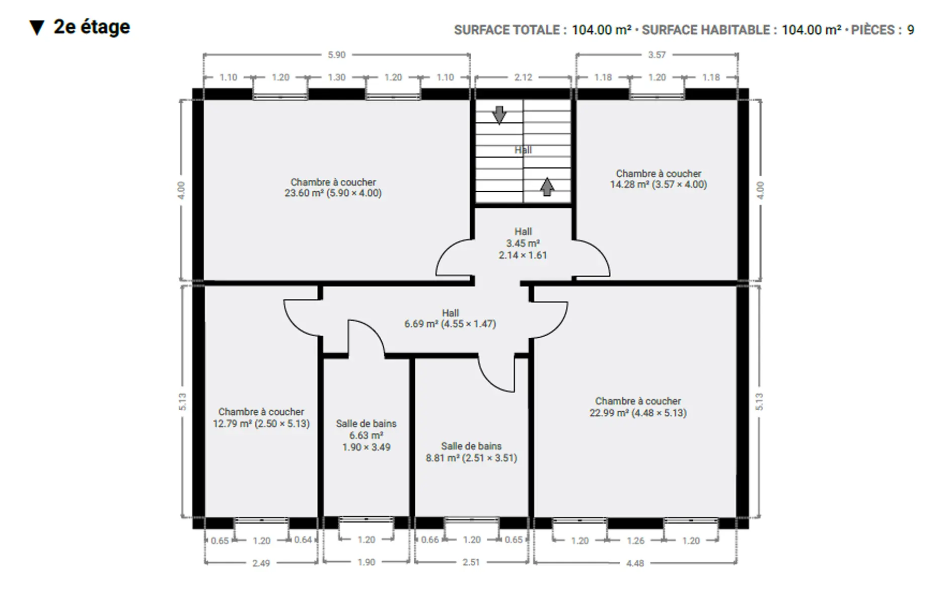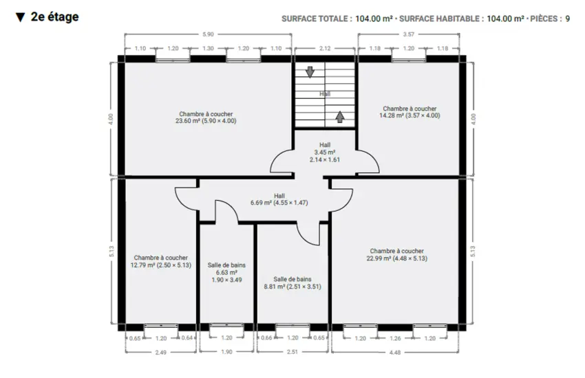 2ème étage : Hall de nuit, 5 chambres (24m², 23m², 13m² et 12m²), salle de bain avec baignoire, salle de bain avec douche.
