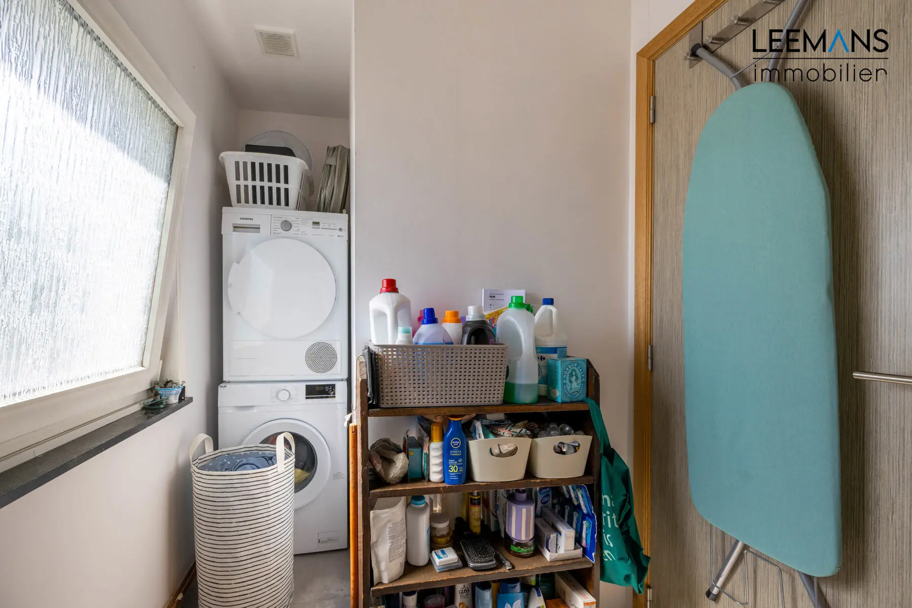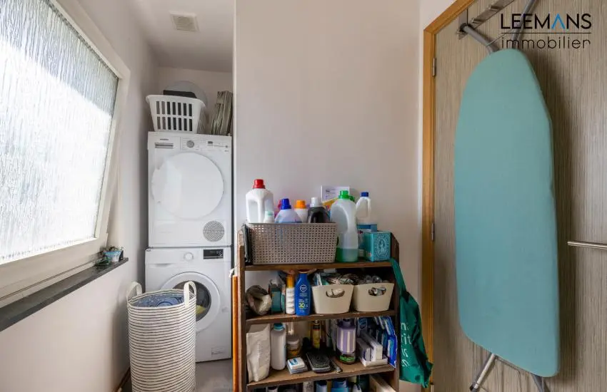 Le rez-de-chaussée se compose d’un hall d’entrée, d'un WC, d’un séjour lumineux (salon et salle à manger ±40 m²) avec baie vitrée et d’une cuisine équipée. À l’étage, on retrouve deux chambres (±12 m² et ±9 m²), un WC séparé, une salle de bain et une buanderie.