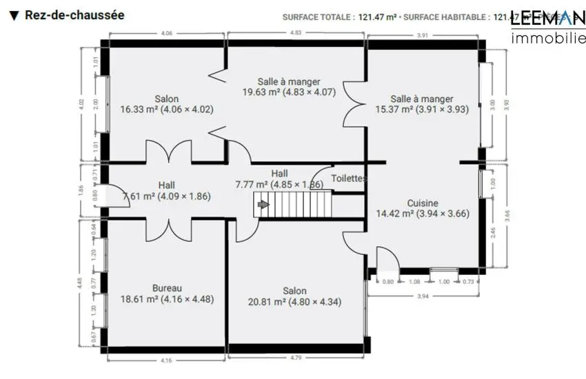Un bureau, un hall et un WC séparé complètent le rez-de-chaussée; ces espaces sont parfaitement adaptés pour l'aménagement d'une profession libérale.